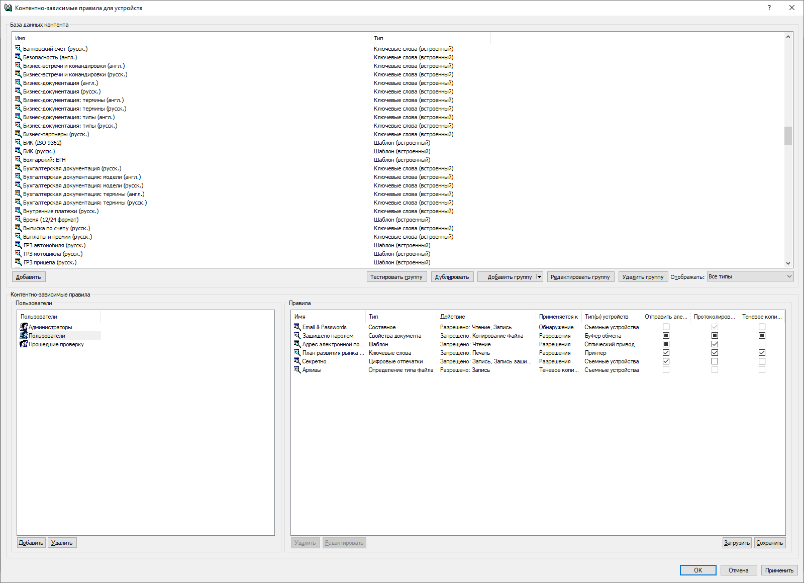 Кибер Протего обеспечивает автоматическое принятие решений о возможности передачи данных по результатам анализа содержимого для всех каналов без необходимости их блокировки в целом. Контентный анализ выполняется в режиме реального времени непосредственно на контролируемом компьютере и не зависит от наличия подключения к корпоративной инфраструктуре. Это позволяет создавать гибко работающие DLP-политики с заданной реакцией на обнаруженные конфиденциальные данные – разрешение или блокировка, отправка тревожного уведомления, создание теневой копии, а также запись экрана и клавиатуры.