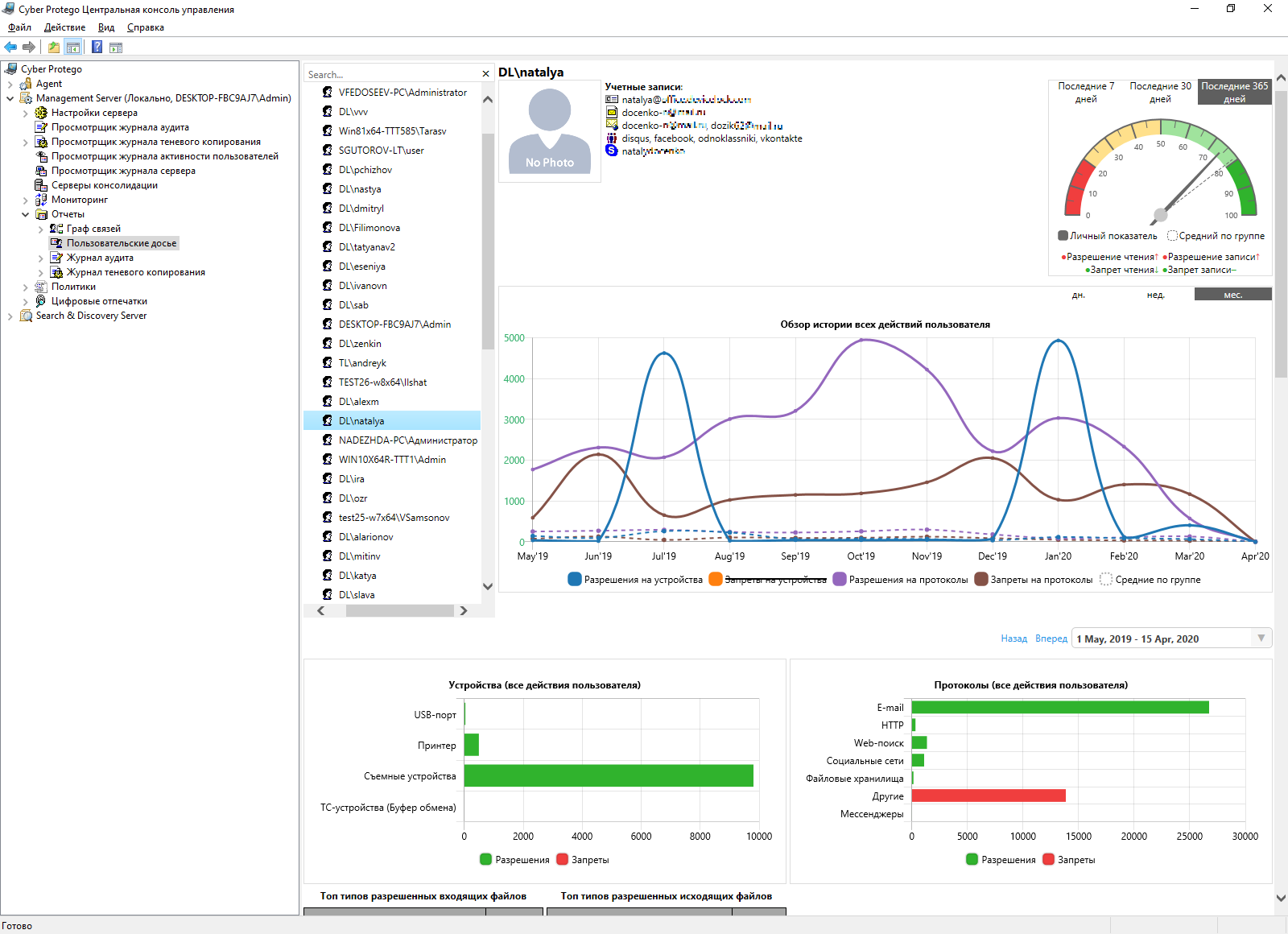 Кибер Протего обеспечивает мониторинг потоков информации, в том числе детальное протоколирование событий и оперативные уведомления, избирательное создание точных копий переданных данных, запись активности пользователей для критических инцидентов, в сочетании с возможностью построения различных отчетов.